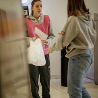 Distribution de sacs, explications et échanges avec les clients du magasin sur les besoins de l'association.